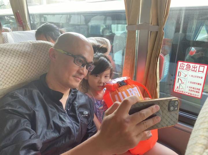 书瑶和“泳士爸爸”在出发大巴上