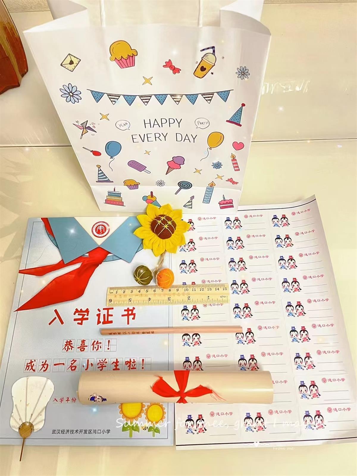 记者了解到,武汉经开区沌口小学每年尤为重视新生的“入学礼”,今年也为学生准备了心意满满的“新生大礼包”,里面有校长用毛笔撰写的《给新生的一封信》、一枚定制小青葵勋章、一张仪式感满满的入学证书、一份有心的新生入学指南、一张DIY姓名牌、一个印有学校吉祥物的墨韵书签、一张专属姓名贴、一份学校宣传册,希望给予学生庄重而难忘的“入学仪式感”。