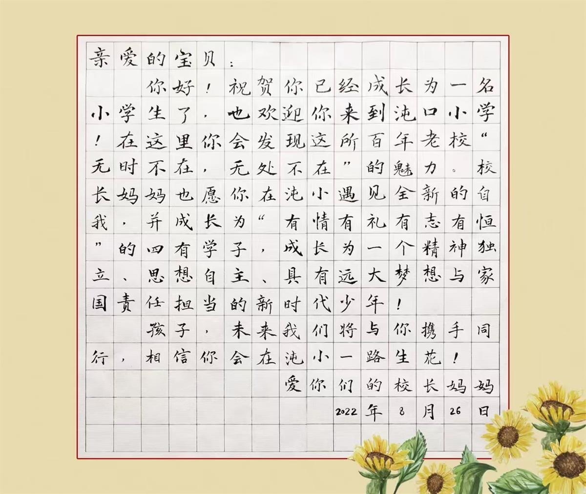 “校长的毛笔字写得真好看!我要好好地在学校学习书法,端正写字,认真学习!”一年级(2)班新生黎雅馨同学一边欣赏着大礼包里的校长写的亲笔信,一边奶声奶气地赞叹道。