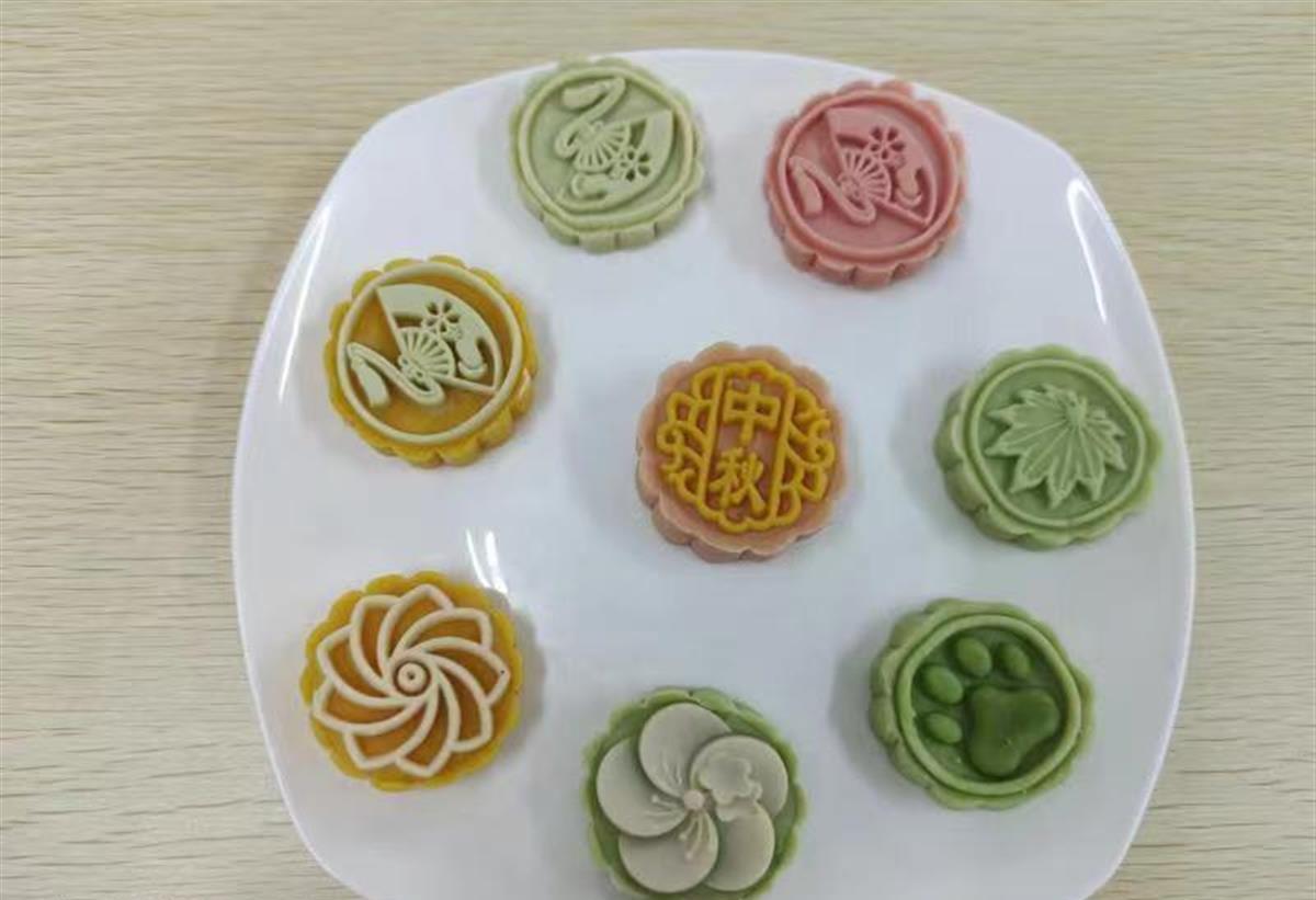 学生们为准备月饼花了很多心思和精力,月饼制作看起来简单,做起来需要很多技巧。“面皮需要配色好看和有新意,表面光滑和平整,这些需要把握力度,我早上一个小时,大概做了接近十个月饼,希望新生们能喜欢。”大二学生李晓莉说。现场同学们围坐成一圈,桌面铺上一层塑料膜,只有简单的模具,还有一个小电子秤用来精确月饼配料比。