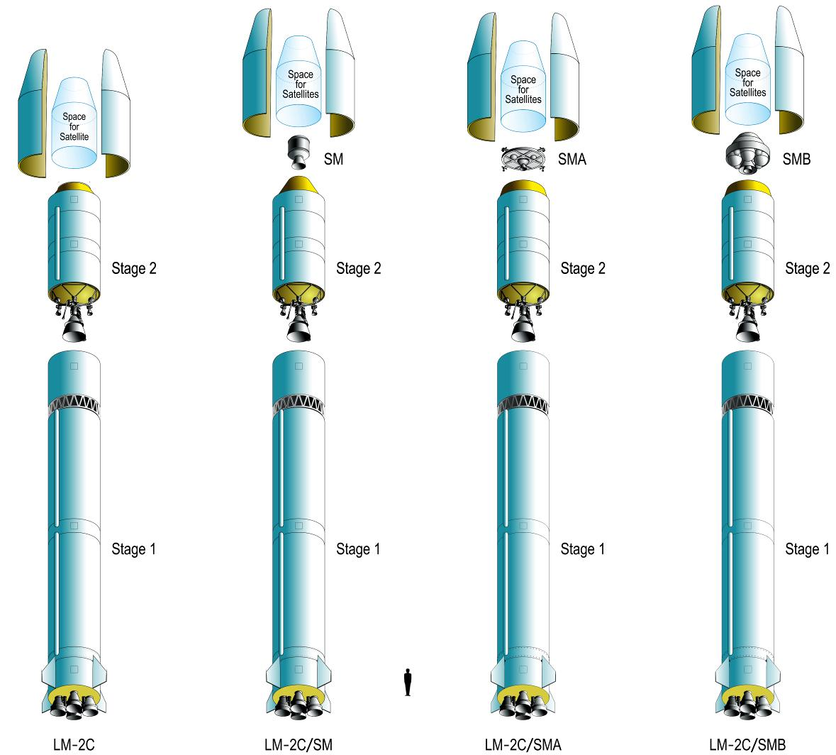 我国以长二丙火箭为基础,后又研制出了带固体上面级的长征二号丙/FP、长二丙/SM、长二丙/SMA和带液体上面级的长二丙/YZ-1S构型火箭。长二丙及其改进型火箭是长征系列运载火箭中唯一同时具备发射近地轨道(LEO)、太阳同步轨道(SSO)、地球同步转移轨道(GTO)及大椭圆轨道卫星能力的运载火箭,发射方式有单星发射、串并联双星、并联三星发射、侧挂多星发射。因此长二丙及其改进型火箭是我国目前运用最灵活、用途最广泛的运载火箭。