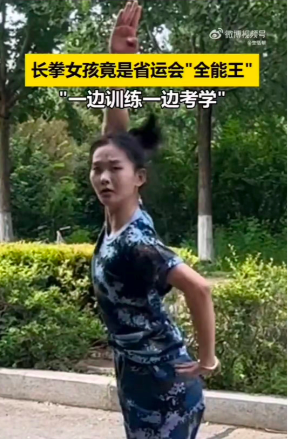 8月30日,山东师范大学新生军训间隙,一名女生进行了武术表演,动作一气呵成,惊艳全场。这名女生名叫李美婷,身姿矫健,拳法精湛,她在接受媒体采访时表示,自己习武已经十二三年。在不久前举行的山东省运动会上,她刚获得了女子甲组长拳、刀术、棍术全能金牌,通过一边训练一边考学,考进了山东师范大学。虽然习武之路很辛苦,但因为热爱,所以坚持。大学四年,她为自己定下了新的奋斗目标:参加大运会。