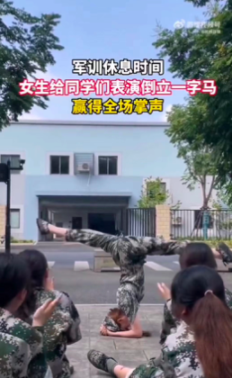 8月份,浙江杭州,一名女生在军训休息时大秀绝技表演倒立一字马。令人惊艳的是,倒立过后,女生的双腿开始旋转,而且是逆天的180°,且整个过程平稳,是标准的一字马状态。看到这一幕,周围的同学开始鼓掌并响起了尖叫声,大家直呼“太厉害了”“太美了”“一看就是专业的!”