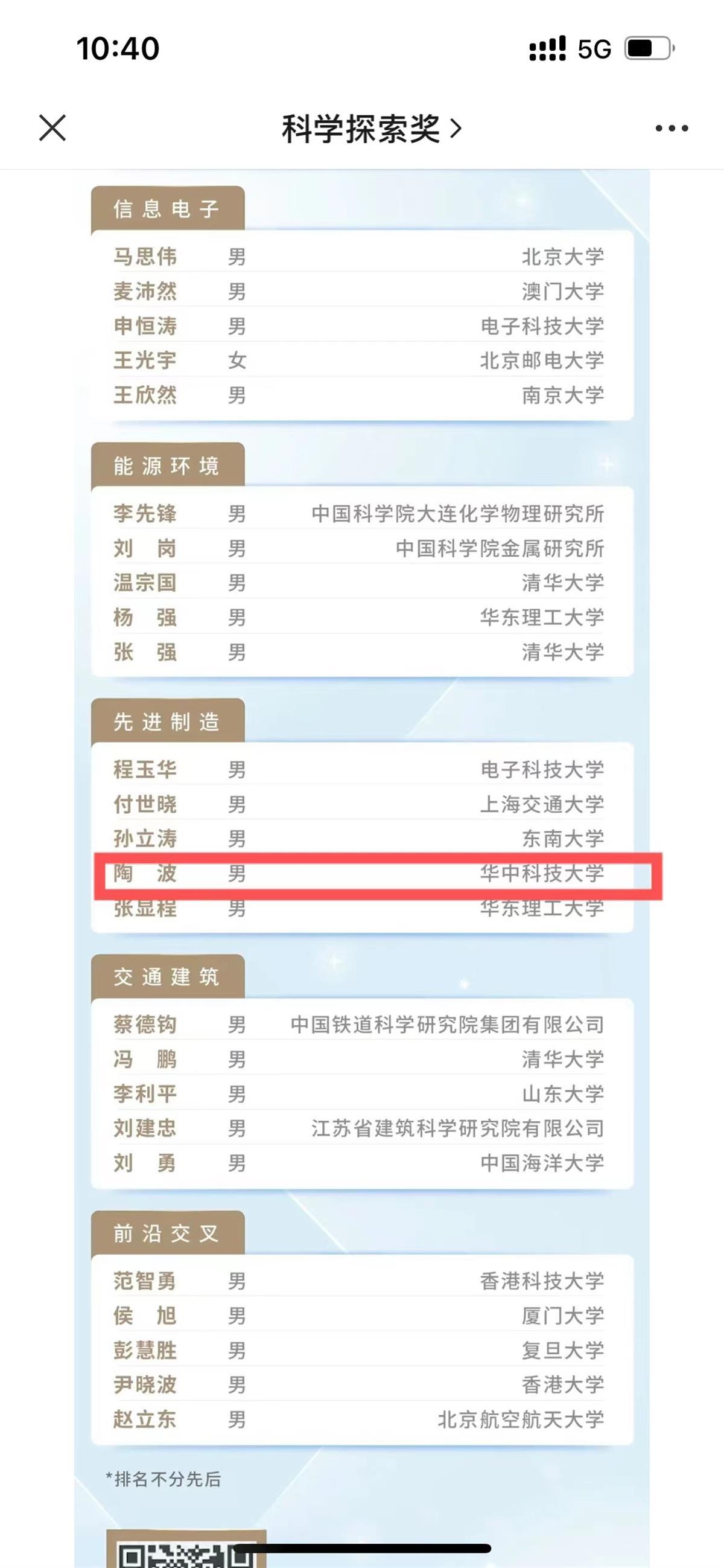 9月15日上午9点时30分,第四届“科学探索奖”获奖名单正式揭晓,华中科技大学教授陶波获得“先进制造”类奖项。