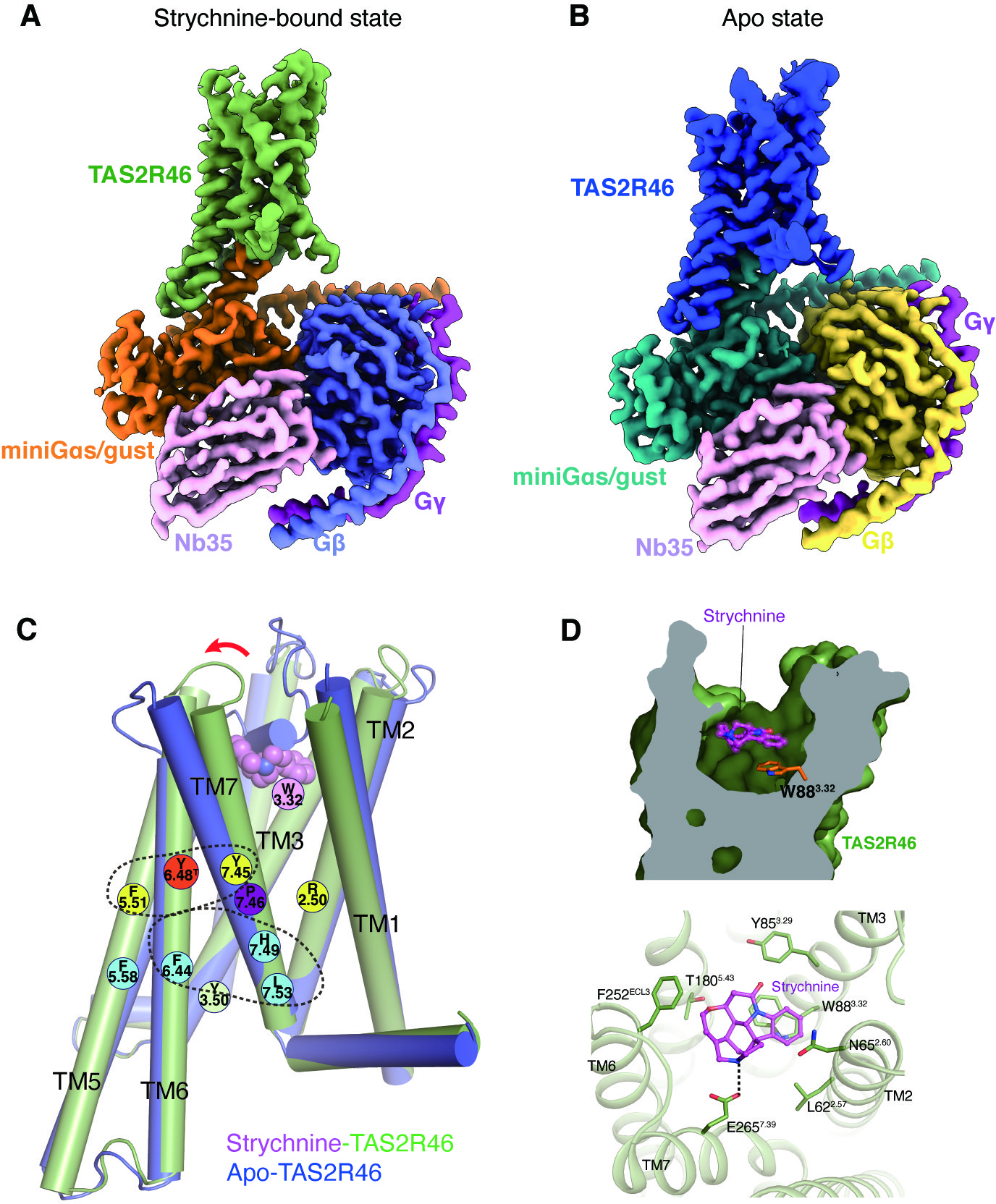 (A-B)分别与马钱子碱(strychnine)结合(A)和Apo状态(B)的苦味受体TAS2R46与味转导素嵌合体的复合物电镜结构;(C)不同状态下TAS2R46的结构比较以及参与受体激活的关键结构域;(D)马钱子碱在TAS2R46里的结合口袋和与其相互作用的关键氨基酸。
