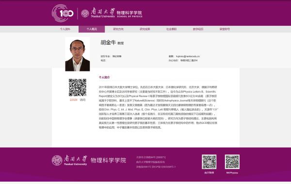 澎湃新闻记者9月17日查询发现,南开大学物理科学学院官网胡金牛教授在个人简介中写道:“2011年获得日本大阪大学博士学位。先后在日本大阪大学、日本理化学研究所、北京大学、德国于利希研究中心开展博士后及访问学者研究(主要是当时找不到工作)。迄今为止在PhysicsLettersB、ScientificReport(被定义为水刊)以及PhysicalReviewC等原子核物理国际顶级期刊发表SCI论文40余篇(原子核领域属于夕阳学科,基本上发不了Nature和Science)同时在AstrophysicsJournal等天体物理期刊(这个影响因子要高那么一丢丢)发表文章数篇(因为最近才发现蒙做天文的比蒙做核物理的专家要容易一点)。”
