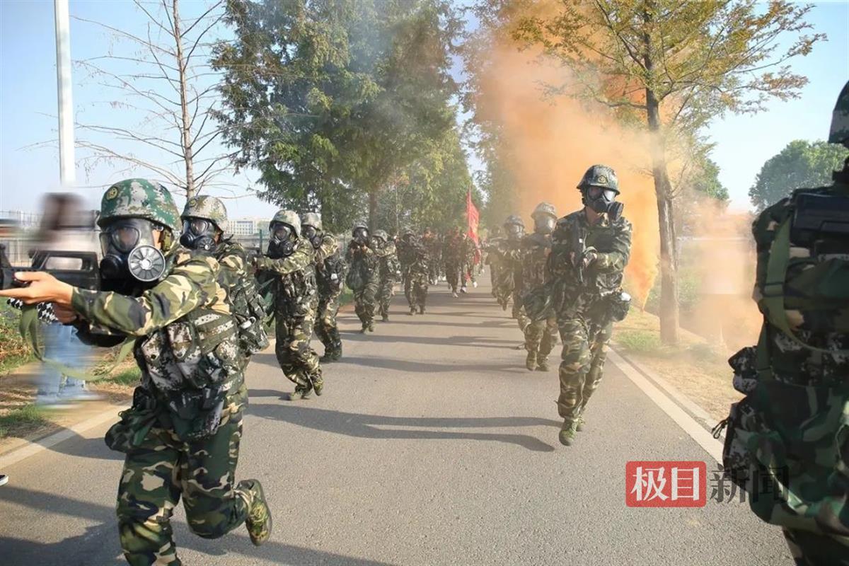 行进中,军训学员们步伐整齐、精神饱满、意气风发。他们或齐唱军歌,或高喊口号,气势如虹,斗志昂扬。与往年不同的是,此次拉练在行军中设置了穿越沾染地带、遇敌空袭、反阻击作战等三个科目,每一个科目都“考验”着军训学员们。“停止行军!”当军训师途经二十四节气柱旁试验田时,突然“毒气”弥漫,浓烟四起,前方道路“毒烟”笼罩,无法视物。