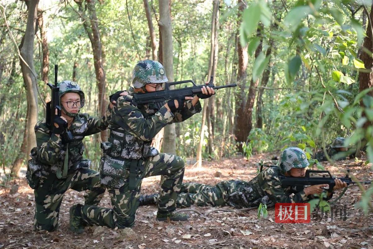 行至狮山绿道,军训师又突遭不明“敌匪”袭击,尖刀班迅速反应,作出反击。“隐蔽!一班向右,二班向左,”尖刀班迅速分成小队冲进丛林,搜索前进,判断敌情,寻找有利掩体,与“敌军”对峙。三班与“敌匪”展开正面战斗,牵制主力,二班则从旁边迂回包抄,其他队员警戒后方来敌,队员李旭阳从后绕过,以右肩冲撞,从腿部拔倒锁喉制服“敌匪”。另一边,一名“敌匪”仓皇逃窜,班长高洋洲从背后过肩摔扑倒,再次擒服。经过激烈斗争,尖刀班队员战胜“敌匪”,成功反阻击。上午11时,随着最后一个团返回东运动场,此次野外拉练活动落下帷幕。