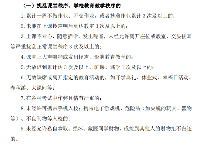 这份细则界定了五类需要教育惩戒的行为,具体包括:扰乱课堂秩序、学校教育教学秩序的;言行失范违反学生守则的;打架斗殴,欺凌同学或侵害他人合法权益的;影响公共环境或形象的;其他违反校规校纪的,并根据失范行为的情节,对不同年级的学生采取不同的惩戒形式。