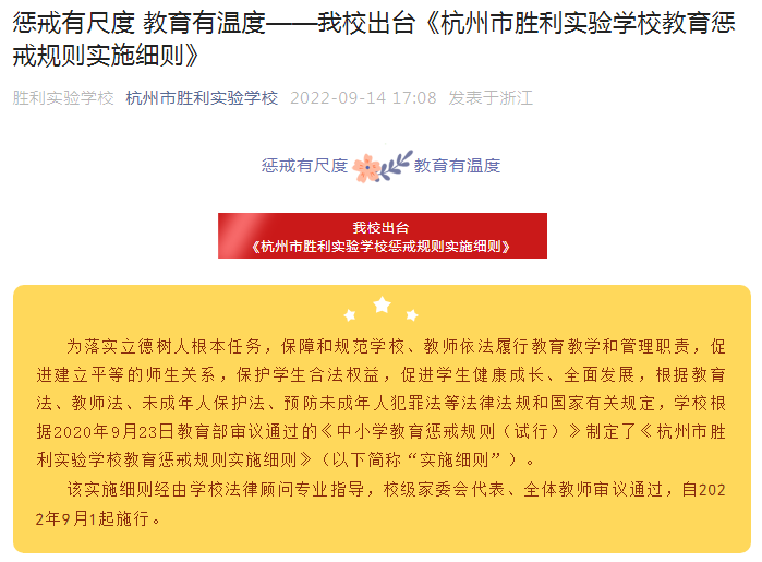 新学期,杭州市胜利实验学校发布了学校首份教育惩戒规则实施细则,立刻受到关注。