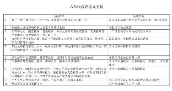 开学伊始,学校各个班级利用始业教育、班会课等组织学生共同学习实施细则,并形成班级、年级的负面行为十大清单。