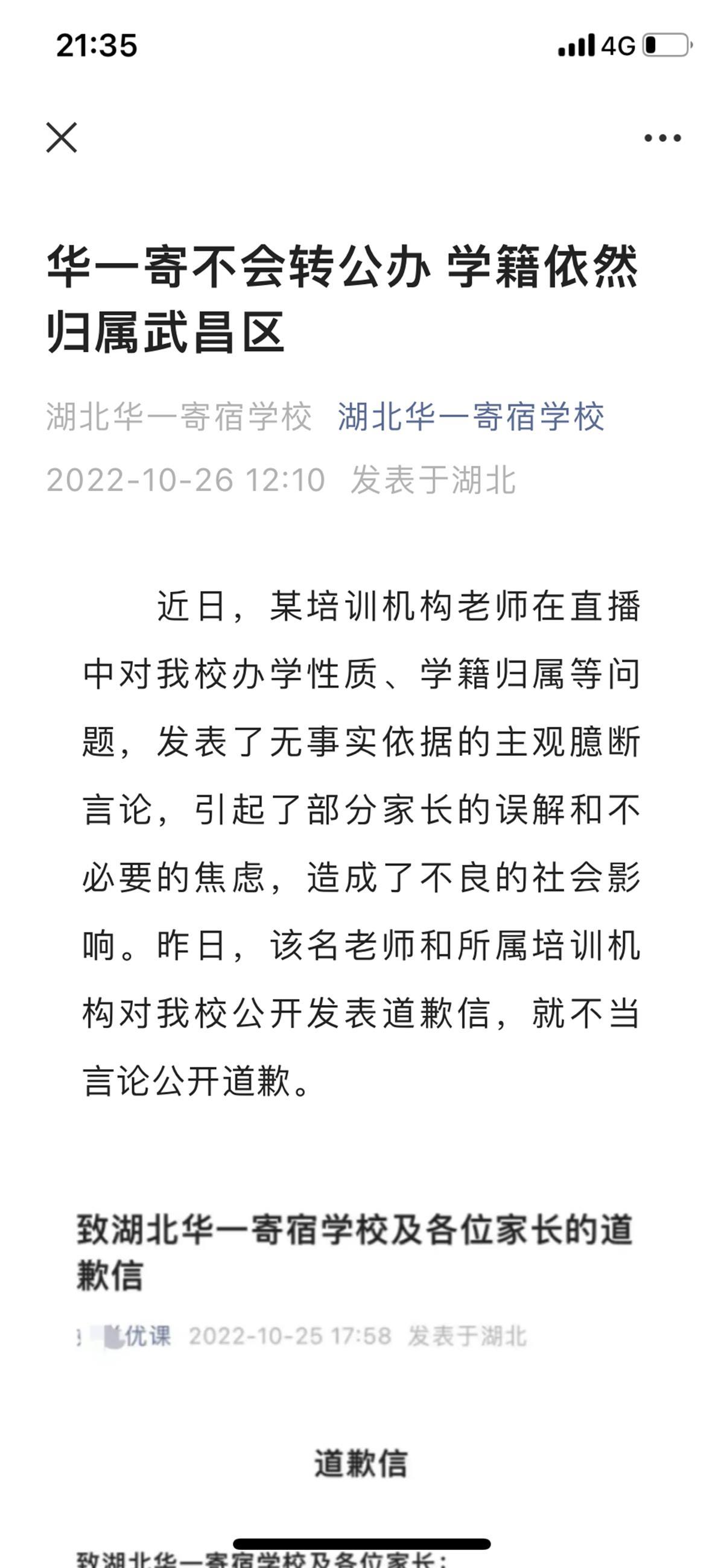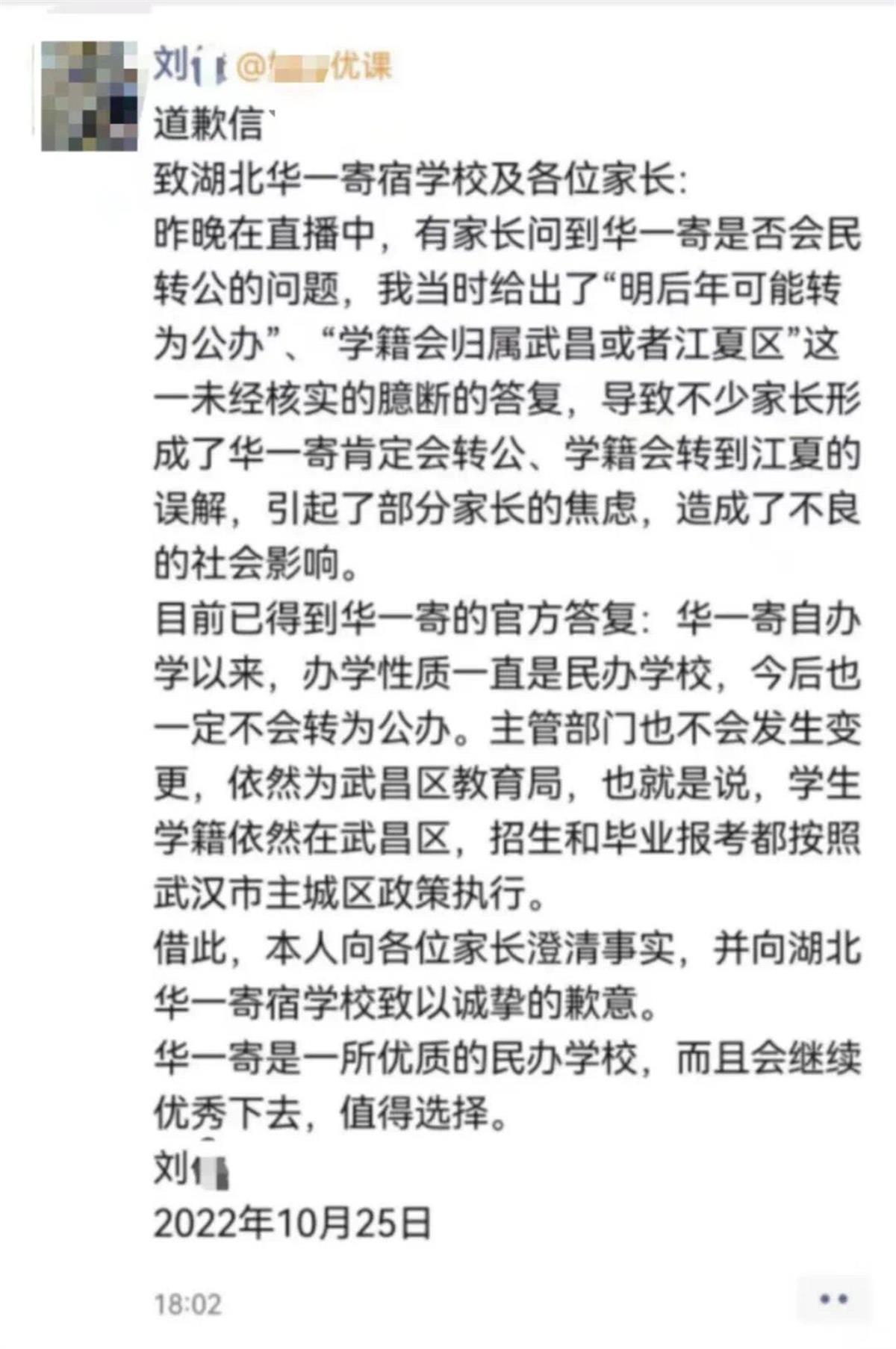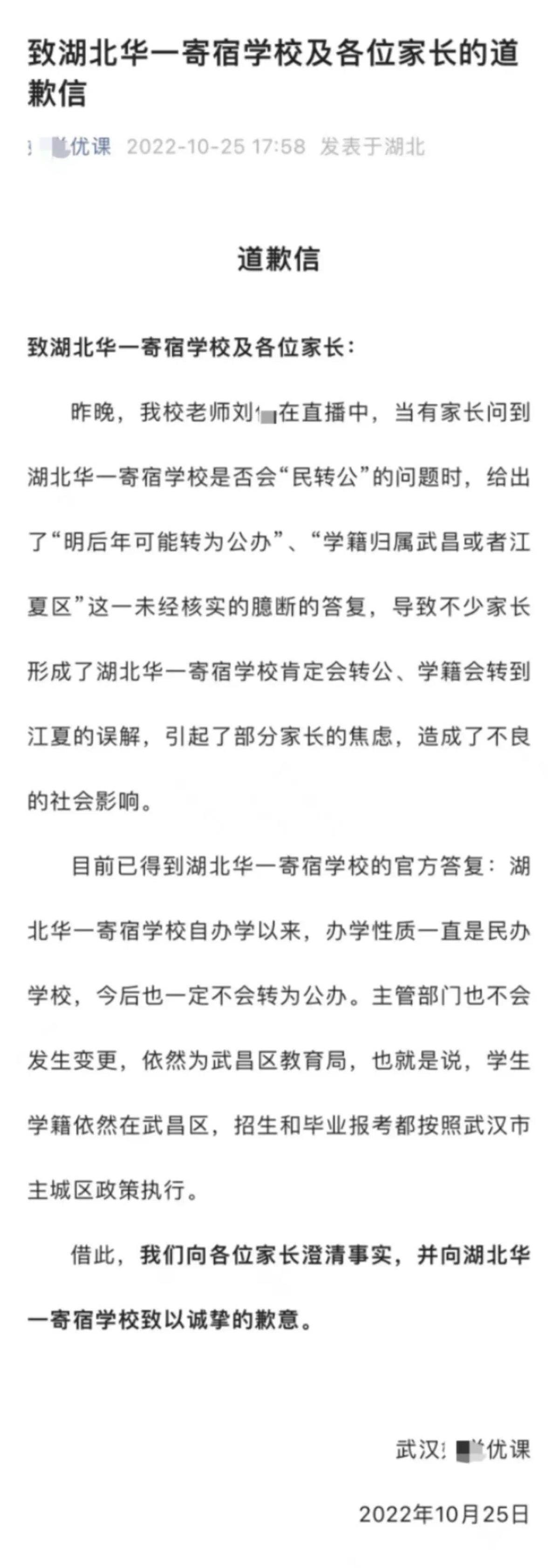 该校在声明中表示,近日,某培训机构老师在直播中对学校办学性质、学籍归属等问题,发表了无事实依据的主观臆断言论,引起了部分家长的误解和不必要的焦虑,造成了不良的社会影响。25日,该名老师和所属培训机构对湖北华一寄宿学校公开发表道歉信,就不当言论公开道歉。