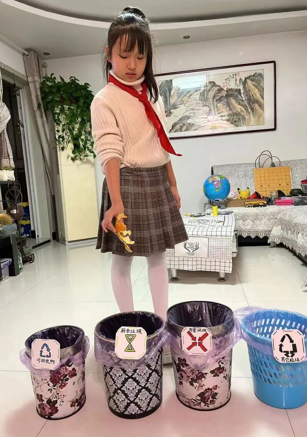垃圾分类,重在践行。队员们在家把垃圾分类后,和家长一起把可回收的垃圾带到垃圾回收点,进行分类投放。实现了“教育一个孩子,带动一个家庭,文明一座城市”的理念。