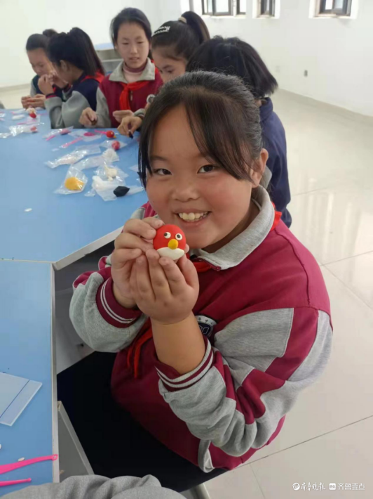 随后,学生们制作了卡通形象“愤怒的小鸟”造型的面塑作品。付老师鼓励大家发挥想象力,大胆尝试。顷刻间,一个个惟妙惟肖、栩栩如生的小鸟形象脱手而出。热闹的课堂上,孩子们近距离的感受和亲身体验了指尖上的艺术之美。