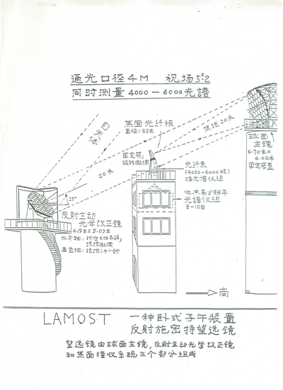 在这次被王绶琯称作“海舟夜话”的谈话结束后不久,他们便把目标定在配置多根光学纤维的“大天区面积大规模光谱”的开拓上。接着是LAMOST建设方案探讨,从陈建生主持的“150/220厘米中国施密特望远镜”的论证,到苏定强设计的“子午装置—焦面跟踪”的施密特型望远镜,再到最终LAMOST方案形成时苏定强“主动反射板”画龙点睛的一笔,LAMOST建设方案先后经过多次学术讨论,三易蓝图。