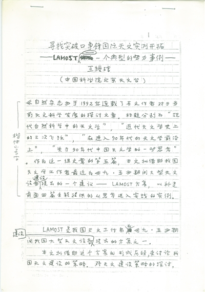 王绶琯《LAMOST——一个典型的努力事例》手稿“老科学家学术成长资料采集工程”供图