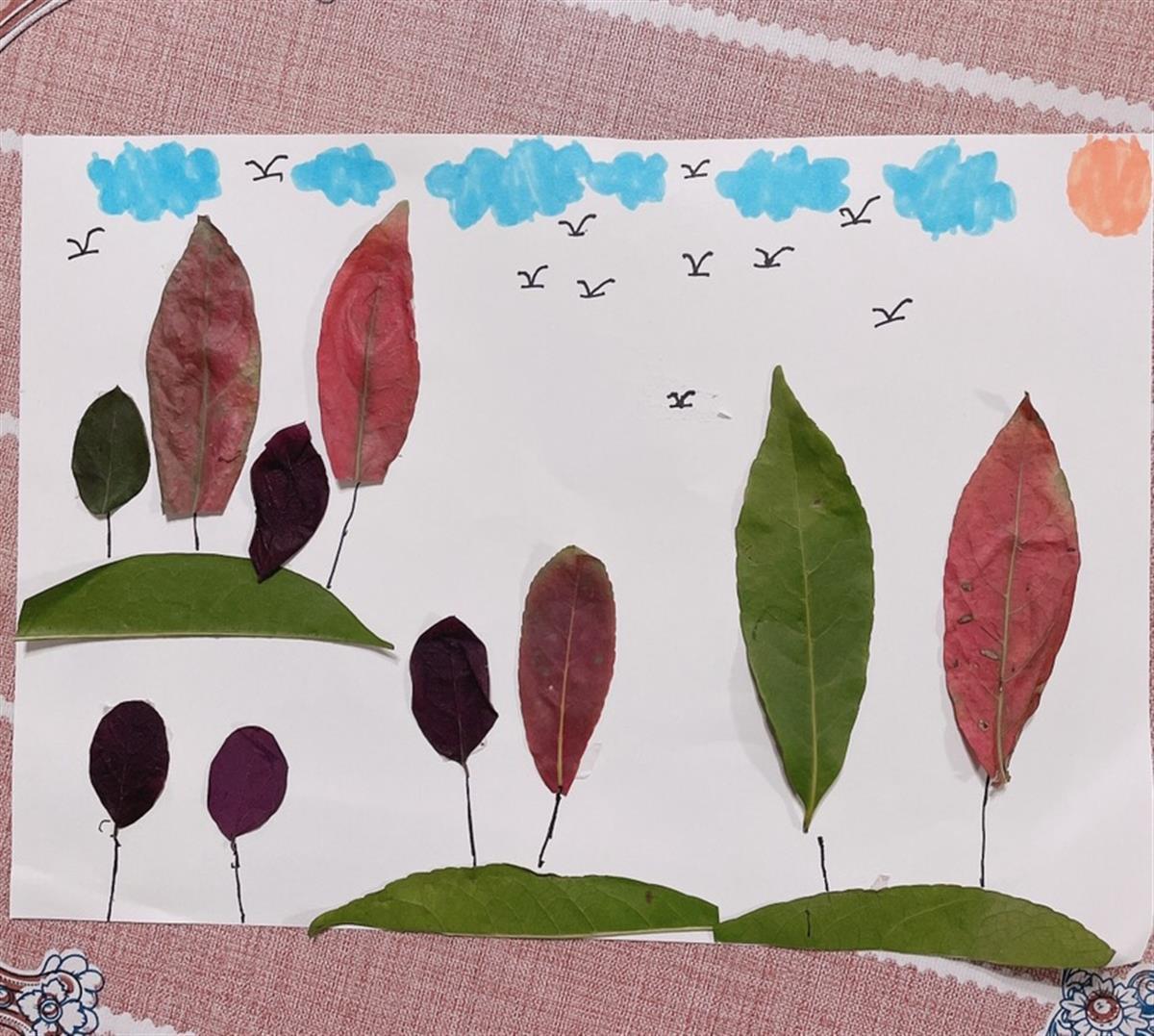 课前,同学们在小区里捡拾落叶,再轻轻把叶子表面的灰尘泥土洗干净,用纸巾把水吸干,夹在书里压平备用。动物世界、落叶即景、秋天的童话……美术课堂上,孩子们发挥奇思妙想,通过修剪、拼搭、粘贴,精心制作了美丽的树叶画。在孩子们的手中,落叶不仅变成金鱼、狮子、孔雀等动物,也变成了一幅幅风景秀美的画作。