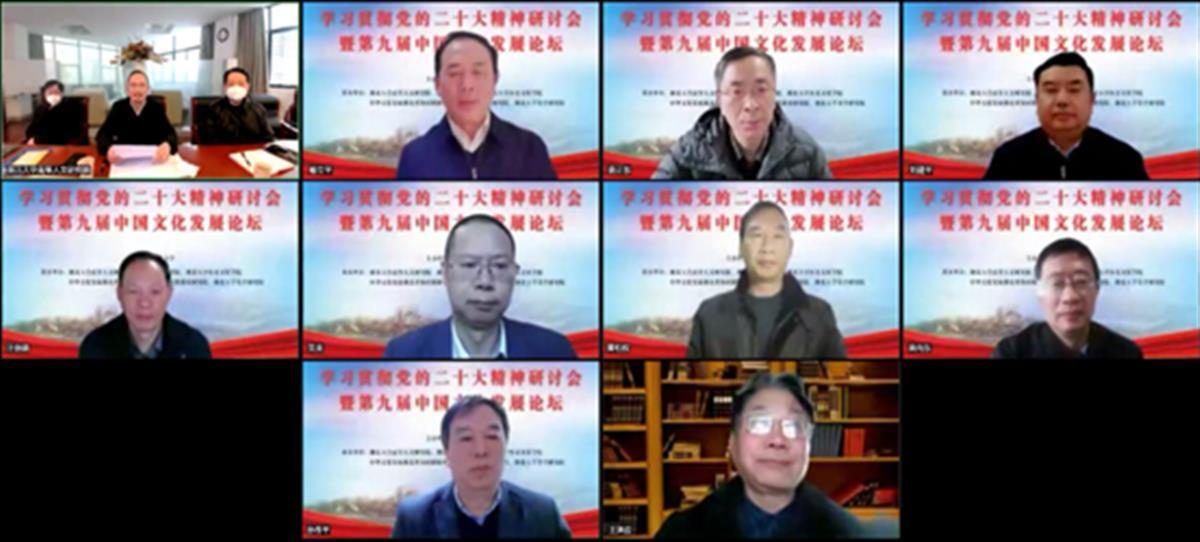 12月16日,学习贯彻党的二十大精神研讨会暨第九届中国文化发展论坛在湖北大学举行。湖北省社会科学界联合会党组书记喻立平,湖北大学党委副书记、校长刘建平,湖北大学人文社会科学资深教授彭富春、江畅出席论坛。武汉大学人文社会科学资深教授汪信砚、北京师范大学吴向东教授、南京大学唐正东教授、吉林大学贺来教授、湖南师范大学王泽应教授、上海大学孙伟平教授、湖北大学黄柏权教授等知名学者通过线上的形式出席会议,并围绕“中国文化发展与中国式现代化”论坛主题进行主旨报告。