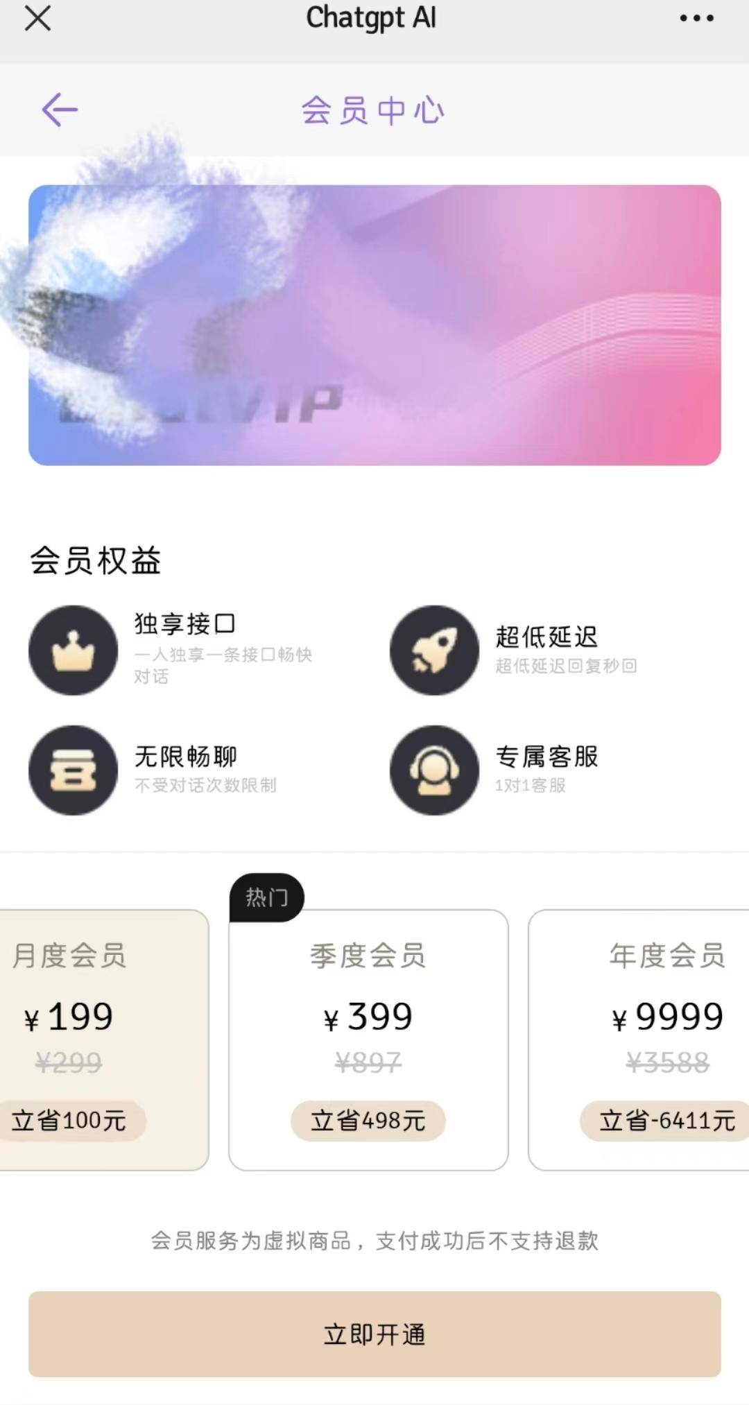 以公众号GPT深蓝为例,2月8日这个公众号迁移到另一个公众号上,虽然新公众号中尚未发布任何内容,但在服务栏中还能跳转“官网”,在官网plus中跳转的一个名为ChatgptAI页面显示现有三档会员充值权益,199元为月度会员,399元为季度会员,9999元为年度会员。同时跳转的页面还显示有“加入代理赚钱”这个选项,能够参与分佣。这一公众号的认证类型是个体户,认证主体为某百货店。