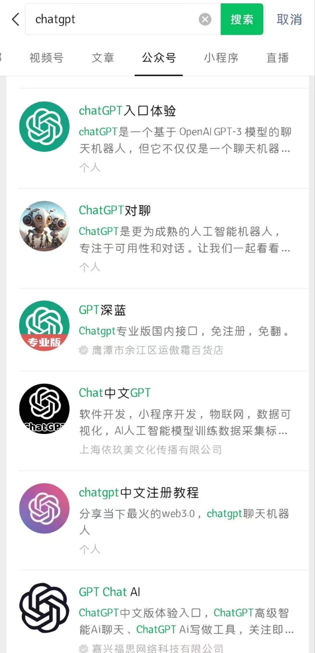 2月7日,记者在微信小程序中以chatgpt为关键词进行搜索,可以查找到大量长得非常像chatGPT的小程序,以chatGPT体验、chatGPT对聊、chat中文GPT、GPTchatAI等为名称,小程序图标大多直接搬运或者对openAI公司的标志进行修改后使用,猛一看还真是真假难辨。但是点进小程序很容易就能发现端倪,其所属公司并非openAI,有的是国内某公司开发,还有的是个人,大多注册于近几日。
