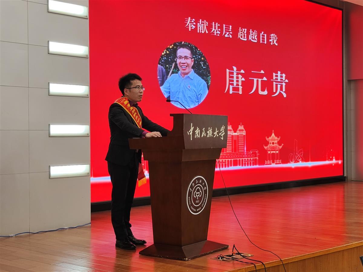 2007年毕业于汉语言文学专业的唐元贵,如今是横琴粤澳深度合作区城市规划和建设局特级政务人员。在中南民大上学期间,唐元贵获得过院、校“创新能手”称号,毕业后他将这种创新精神一以贯之,在担任东莞市虎门镇人民政府驻韶关市仁化县周田镇灵溪村党总支第一书记、扶贫工作队队长期间,统筹贫困户共同打造出灵溪村第一个贡柑品牌产品。他帮扶贫困户,将传统渠道与新兴平台相结合,集聚了大量人气,彻底改变了灵溪贡柑往年滞销的局面,帮助贫困户与村民实现了近500万元的消费扶贫销售额,被誉为“乡村李佳琦”。