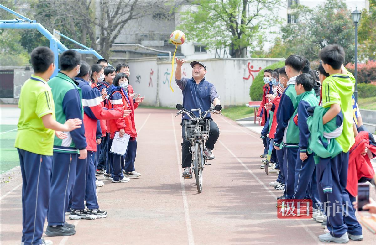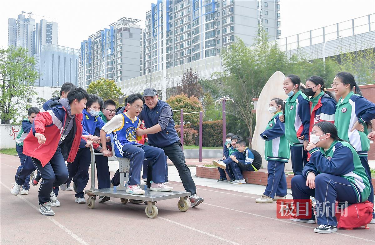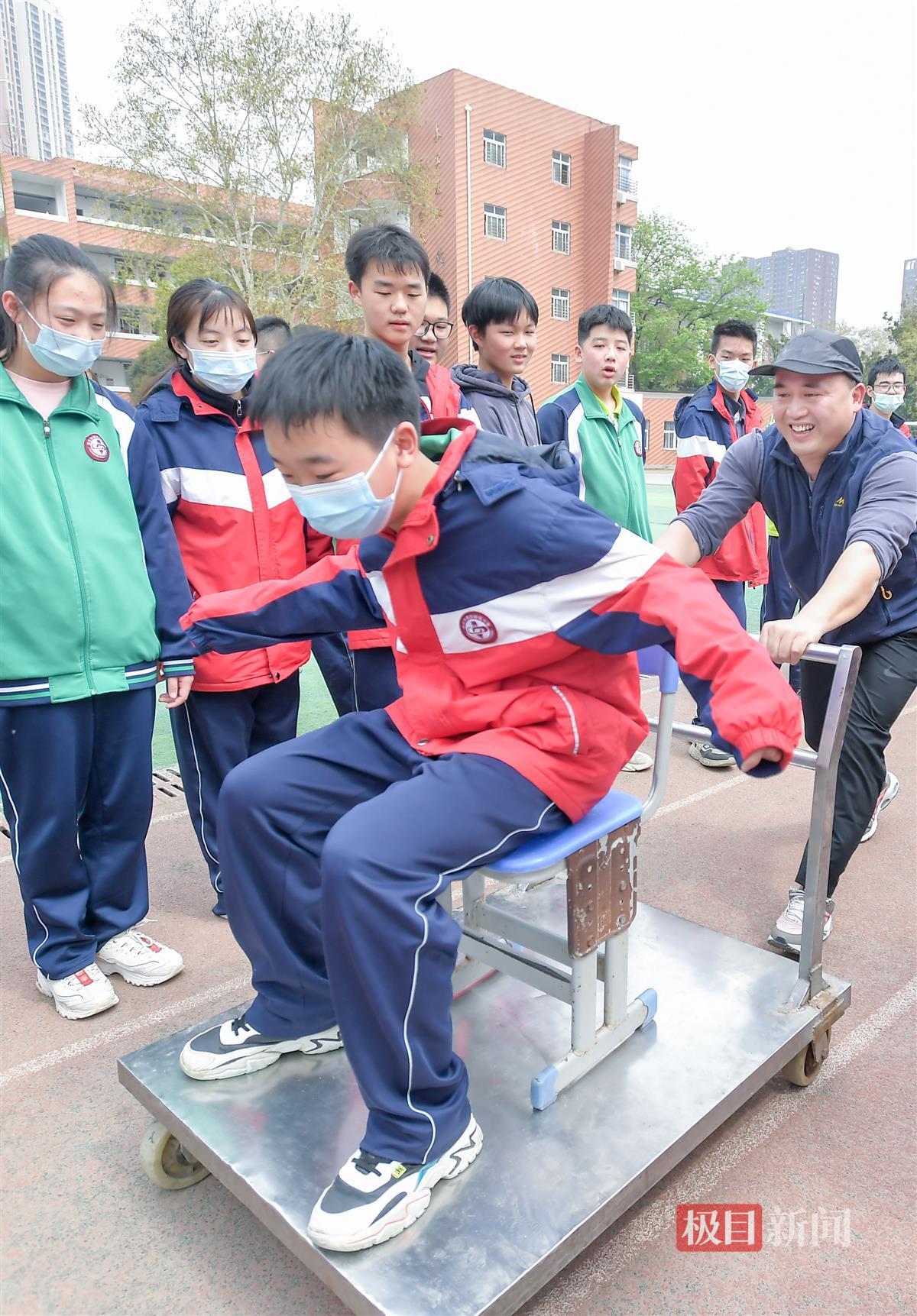 “注意看,球在空中发生了什么?”3月27日午间时分,武汉市第四初级中学操场的一角,师生们正接力挑战脚踩平衡车抛球、急刹小推车、攀爬国旗杆……这些看似杂耍的户外游戏,实则是八年级8班的学生们,在物理老师徐建峰的指导下进行的户外力学实验。