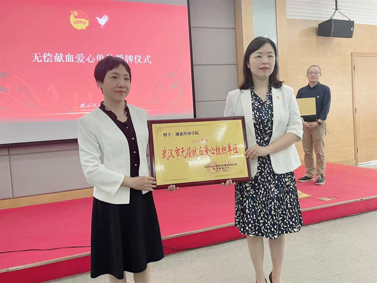武汉血液中心向湖北经济学院颁发了“武汉市无偿献血爱心单位”荣誉奖牌。武汉血液中心党委副书记、纪委书记郑婕表示,“以湖北经济学院为代表的热血高校,不仅为全市临床用血保障贡献了生生不息的热血力量,还将‘无偿献血、拯救生命’理念注入到每一位青年学子的心中,通过他们的爱心接力和传承,营造了‘人人讲奉献、人人献爱心 ’的浓厚社会氛围。”