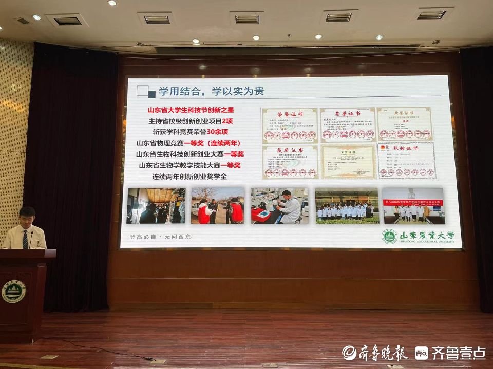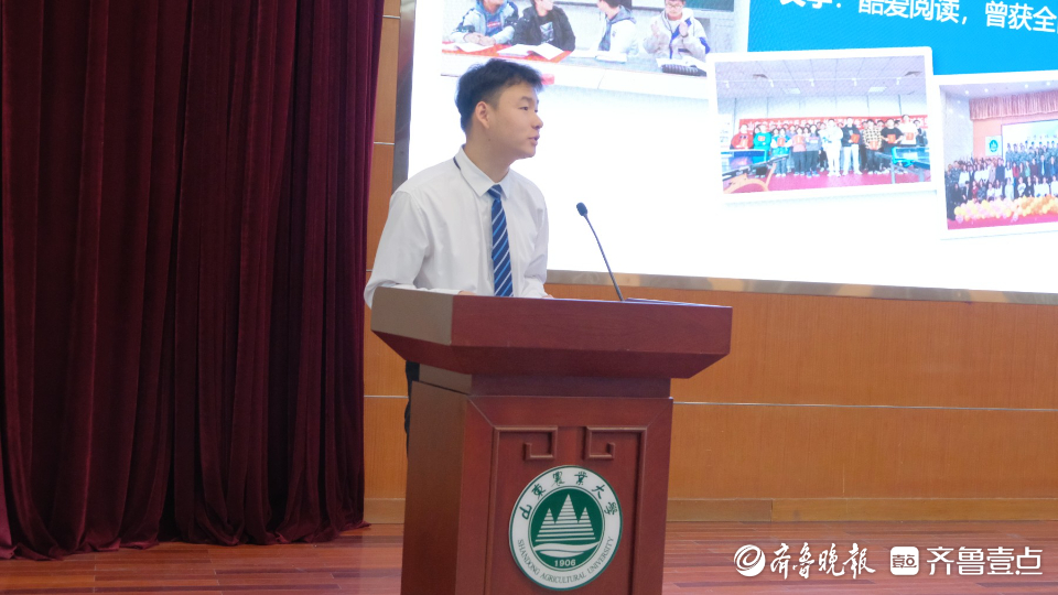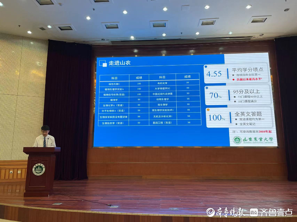 来自生命科学学院生物科学专业2019级本科生倪鑫波用自己的成长经历做了报告。10门课程满分、72门课程90分以上,连续四年全院第一,平均学分绩点4.55/5的他,如今已推免至清华大学攻读基础医学博士学位。倪鑫波来自浙江绍兴,之所以选择山农,因为这是一所性价比超高的学校,“它是唯一一个有国家重点实验室的省属高校”。