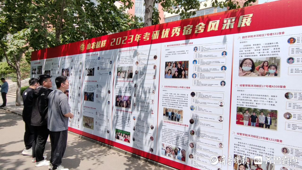 讲座结束后,进入参观环节。在志愿者的带领下,学生和家长们穿行在这座绿树成荫的百年老校中。途经图书楼时,大家被一个巨大展牌吸引住,展牌上展示的是山东农业大学2023年考研优秀宿舍。山东农业大学学生工作处副处长宋伟介绍说,今年全校59个宿舍全员考取研究生,农学院种子科学与工程专业2019级2班、化学学院本科生党支部2个集体升学率超过90%。