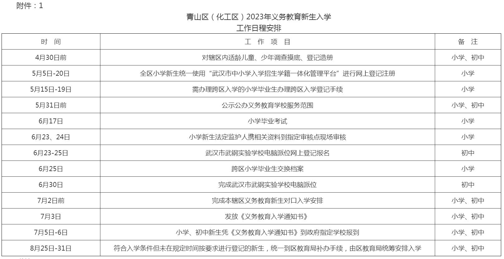 青山区(化工区)小学适龄儿童新生入学工作采取网上登记、线下审核的方式,全区小学新生登记注册工作统一使用“武汉市中小学入学招生学籍一体化管理平台”(以下简称“入学招生平台”)进行,于5月5日—20日实行网上信息注册、登记办理。青山区初中适龄少年新生入学工作采用线下审核方式进行。武汉市武钢实验学校通过电脑派位方式确定新生入学名单,工作方案经区人民政府同意后实施。电脑派位未能进入武汉市武钢实验学校的学生,按招生政策安排入学。