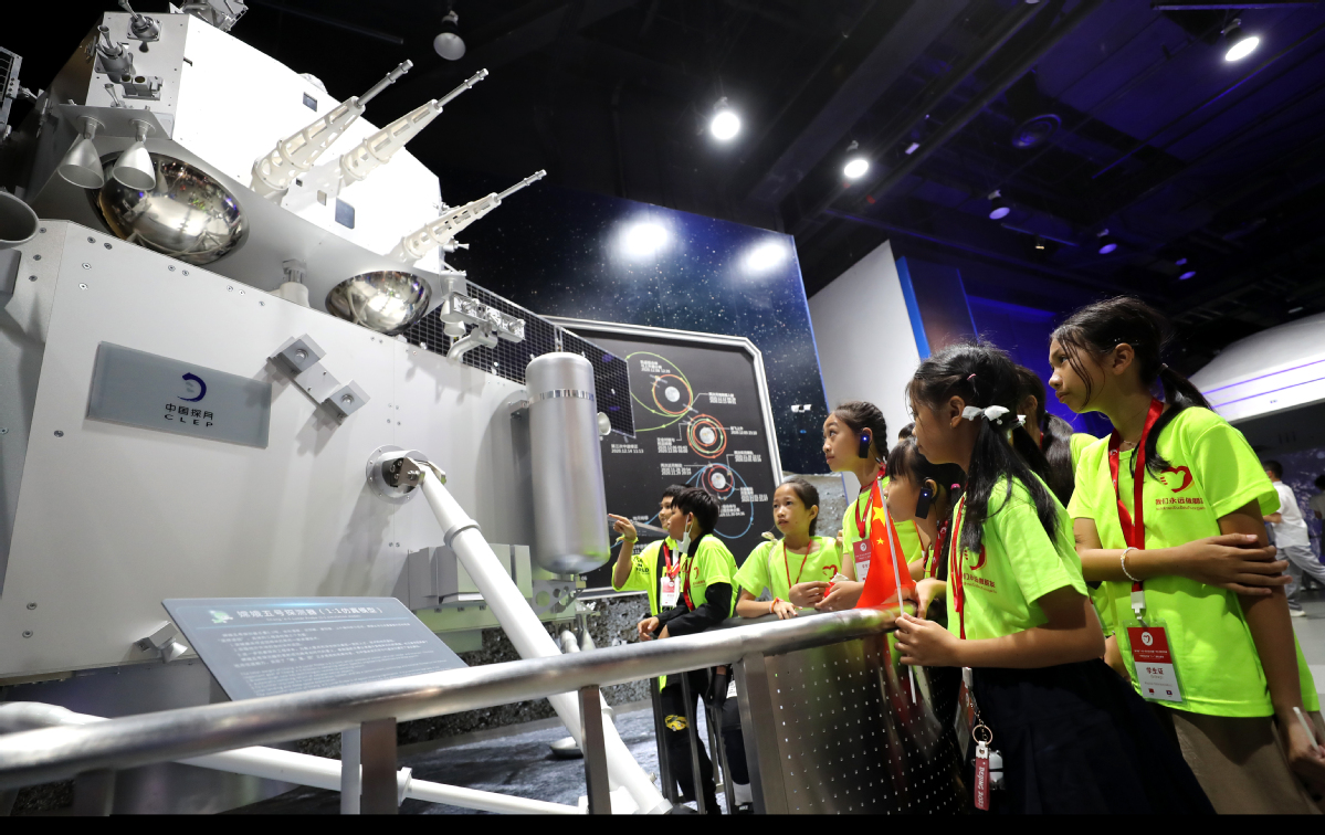 5月31日,来自老挝的学生参观嫦娥五号探测器(1:1仿真模型)。中国日报记者张威摄