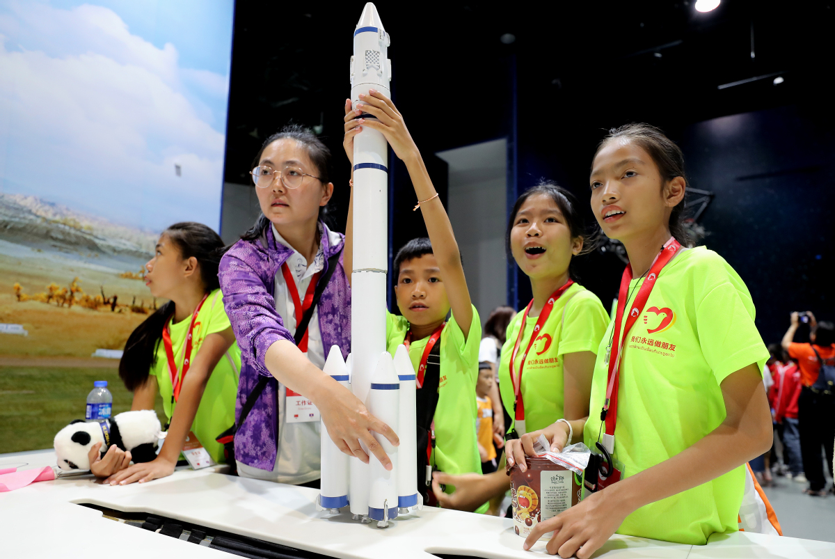 5月31日,来自老挝的学生了解火箭发射过程。中国日报记者张威摄