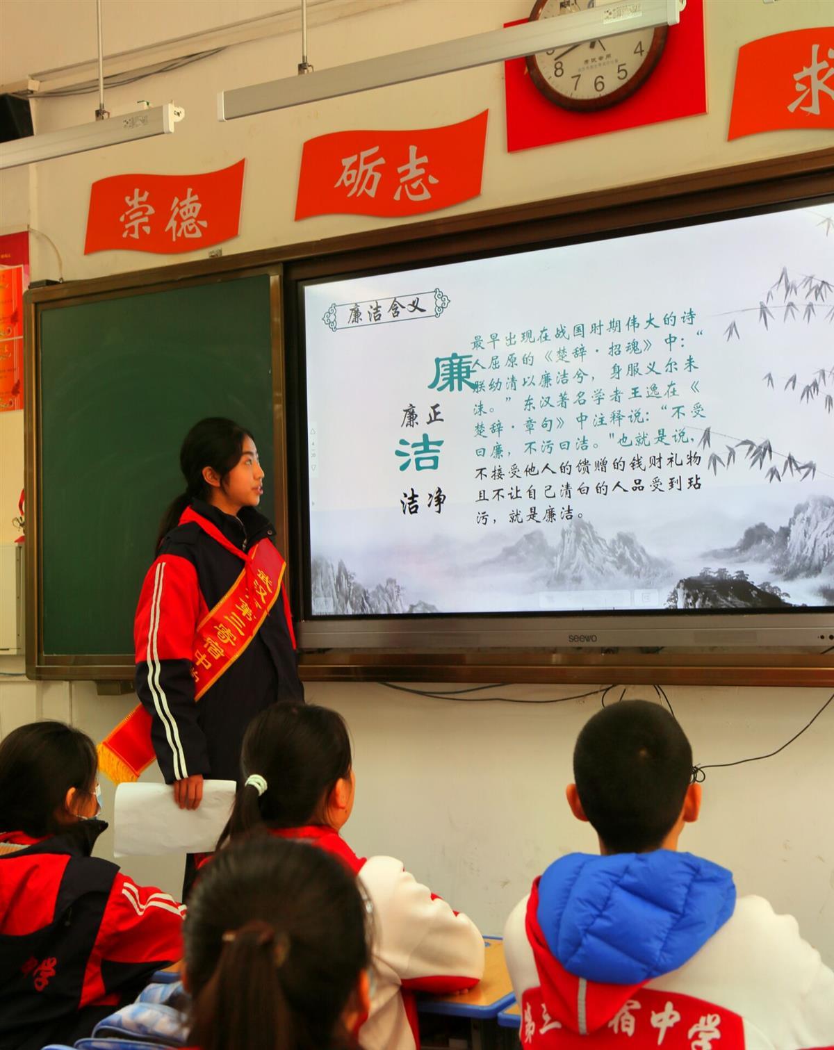 不仅倡导教师“讲清廉”,还重视引导学生“学清廉”“诵清廉”。学校成立学生清廉文化宣讲队以来,每学期都积极开展宣讲活动,“小讲师”们在各班级向同学们讲述廉洁小故事,将自己的思考分享给其他同学,向更多人传递廉洁文化正能量。