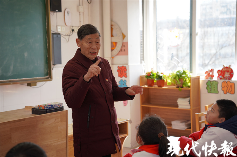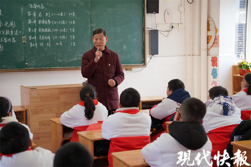 “同学们,在一些重要节日我们要组织开展各具特色的民俗文化活动、纪念庆祝活动,增进家国情怀,你们知道都有哪些节日吗?……”2月下旬,位于南通市崇川区的文亮小学里,81岁的冯吉仁挺直腰板,正精神气十足地给孩子们解读着《中华人民共和国爱国主义教育法》。他用最容易让孩子们理解的方式,讲解着一个个专业名词,让他们了解其中的意义。每个小朋友都听得聚精会神,时不时与冯老师交流互动,现场洋溢着浓浓的学习氛围。作为一名老教师,他退休后也一直没有离开课堂,每天会来到学校进行宣讲。这20多年来,他风雨无阻,为一届又一届的孩子们讲述历史,畅想未来,在他们的心间播撒下爱国的种子。