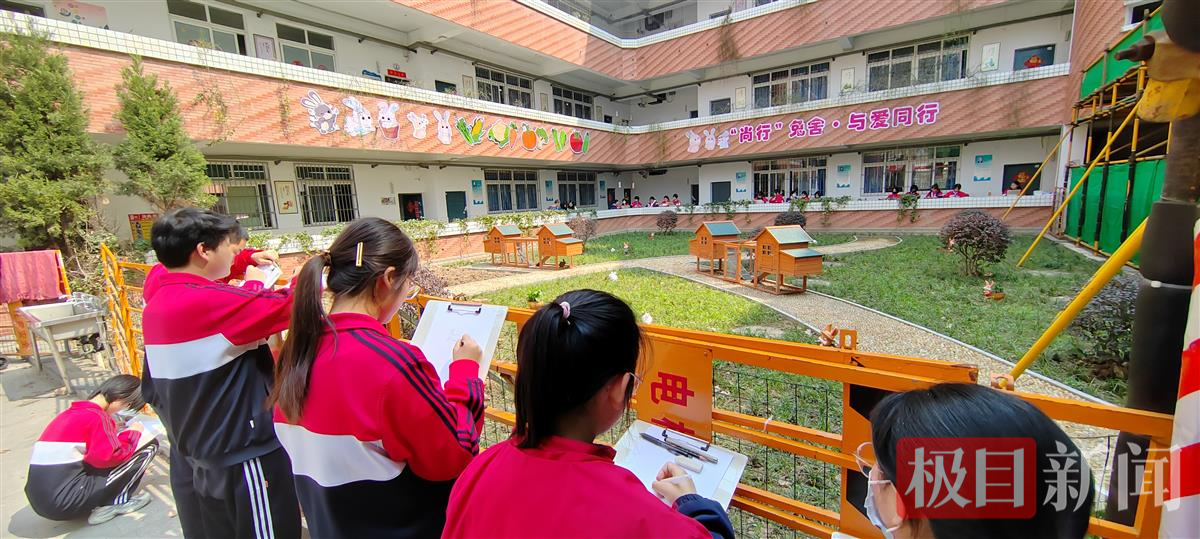 3月21日中午,学生吃完午餐走到户外,便直奔兔舍,观察起乖巧温顺的新“伙伴”们。“最近它们吃胖了,应该多运动,多晒太阳。”“要是能摸摸小动物就好了”“春暖花开,万物复苏,我要把生机勃勃的校园风景画下来!”说起校园萌宠,孩子们有聊不完的话题。