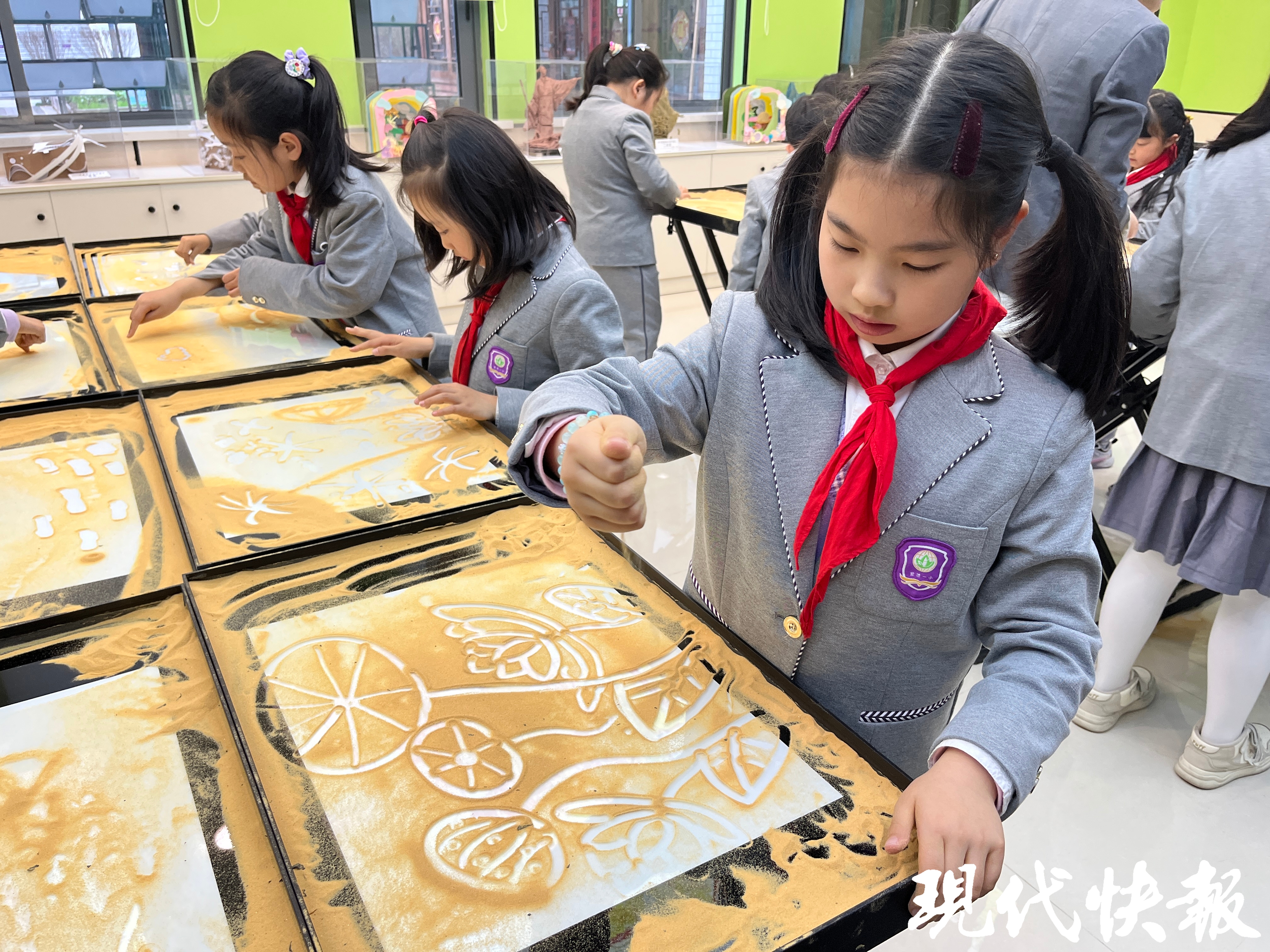 南通市紫琅第一小学二年级(13)班的黄何同学面前,一幅沙画中的荷花亭亭玉立,一旁的莲藕也栩栩如生。因为感兴趣,黄何参加了学校的沙画社团,“我参加沙画社团半个学期了,沙子也可以画画,真的很有趣。”黄何说,学校社团很多,同学们的选择也很多样,除了沙画社团,她还参加了古文社团,对于自己学习古文有一定的作用。