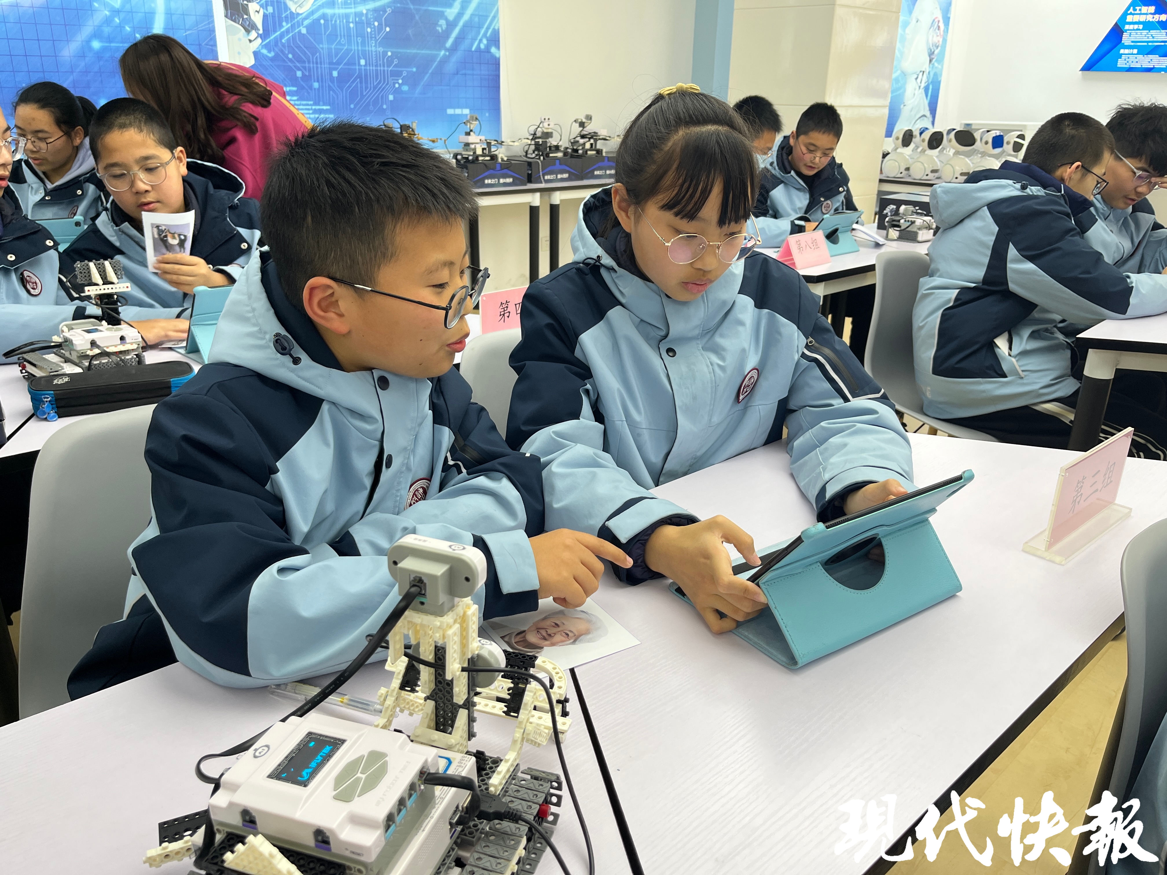 江苏省南通中学附属实验学校里,初一(4)班的顾茗喆正和小组成员完成《走进AI》的课程任务,“这节课主题是传统非遗手艺,我们会通过三个任务,在学习AI技能的同时,了解关于非遗手艺的知识。”从小就对人工智能非常感兴趣的顾茗喆,觉得这门课非常有趣,不仅课程内容多样,还增长了知识,“接触后,我发现生活中很多地方都可以用到人工智能技术,非常神奇,我对机器人更感兴趣了。”