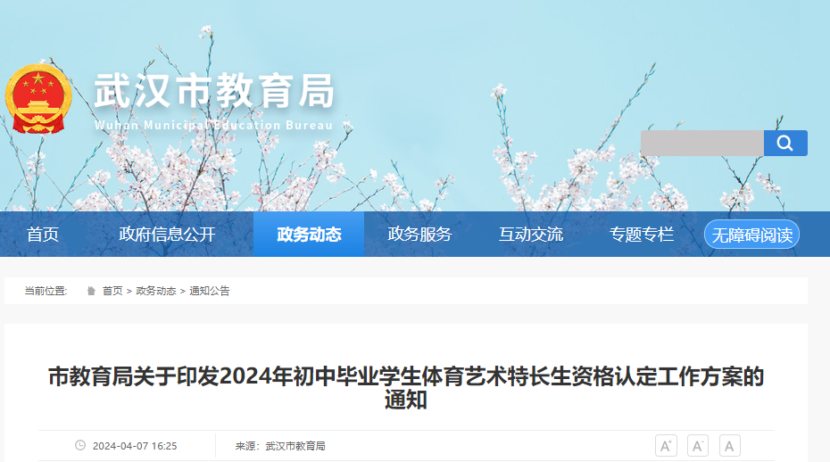 长江云新闻记者获悉,近日,武汉市教育局官网发布2024年初中毕业学生体育艺术特长生资格认定工作方案的通知。详情如下: