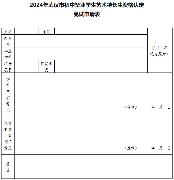 凡符合免试条件的学生在本校或区教育局体卫艺站(中心)申请免试,填写《2024年武汉市初中毕业学生艺术特长生资格认定免试申请表》并附1寸登记照(中考报名照片)。各区对免试资格进行审核,于4月11日前将免试学生信息录入特长生免试总表发送到市教育局体卫艺处邮箱,于4月16日将特长生免试总表(纸质盖章版)和所有免试申请表原件报市教育局审核备案。