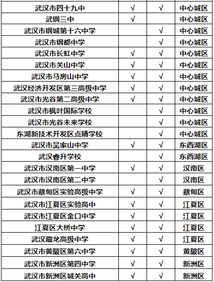 武汉市第十六中学、武汉市实验学校、武汉市第六十八中学、武汉市建港中学、武汉市弘桥中学、武汉市东湖中学、湖北省水果湖高级中学、武汉市三十九中、武汉市钢都中学、武汉市长虹中学、武汉市关山中学、武汉市马房山中学、武汉经济技术开发区第一中学、武汉经济技术开发区汉阳三中、武汉市光谷第二高级中学、武汉东湖新技术开发区点睛学校