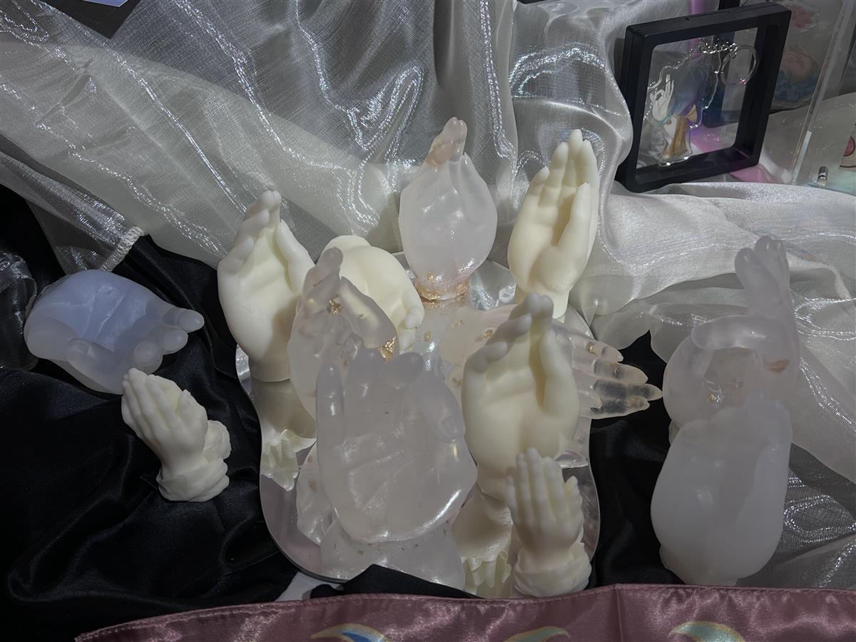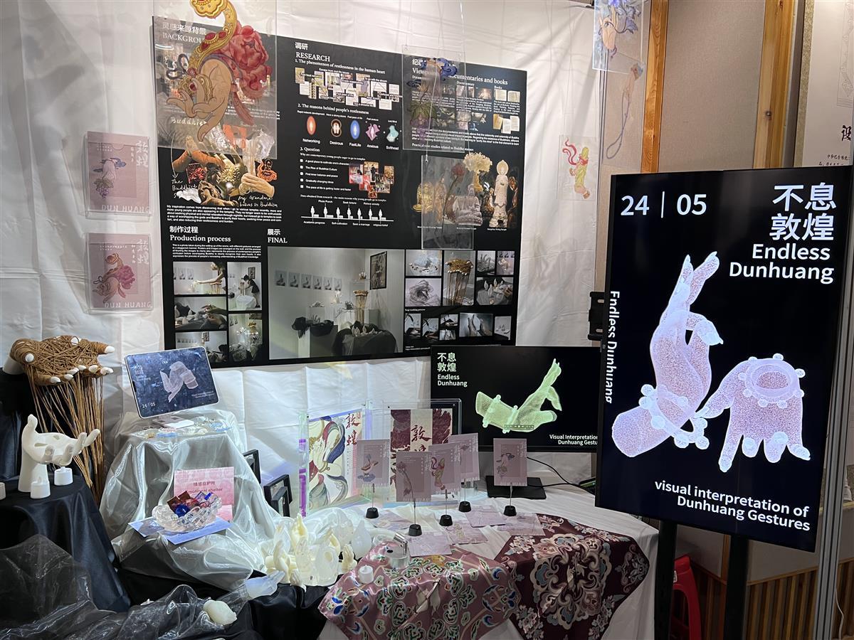 还有同学把艺术目光投向非物质文化遗产传承。敦煌以其丰富的壁画艺术闻名于世,其中手姿更是蕴含着深厚的文化内涵和艺术价值,如何将这些传统手姿进行有效传承和发扬?姚坤穗同学带来作品《敦煌传统手姿形态的数字化创新设计实践》,不仅进行了手势纹样设计和插画设计,还带来线下体验项目。“采用视觉传达理念,专门设计了这些敦煌手姿肥皂,契合当下年轻人的生活需求和情绪价值,让大家在日常生活中,体悟传统文化魅力。”姚坤穗说。