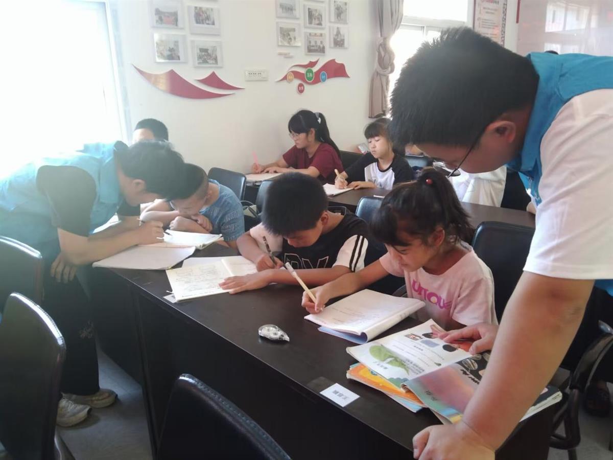 志愿服务队成员辅导孩子学习