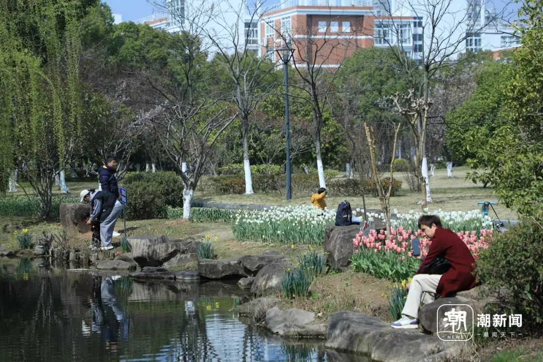 去年郁金香季,学校当时种下的一批郁金香就曾在网上火了一把,今年的又开了,且规模更大、更多。 3月19月,记者根据同学们的指引,在杭电下沙校区第三教学楼旁,找到了这片盛开的郁金香,它们沿水系种植,有红色、黄色、白色还有紫色,倒影在水面上,也很有层次感。 路过的师生,不少都会驻足观赏拍照,赏花的人群中,也有从外校慕名而来的,“我在浙江传媒学院读书,听朋友说这里的郁金香也很漂亮,专程来打个卡。”读大二的齐同学告诉记者,最近很多同学坐一个多小时公交去了太子湾赏花,她不想凑热闹,就另辟蹊径找到这里。