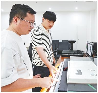 实验室内,张展(左)正在和学生扫描录入甲骨文拓本。 霍亚平摄