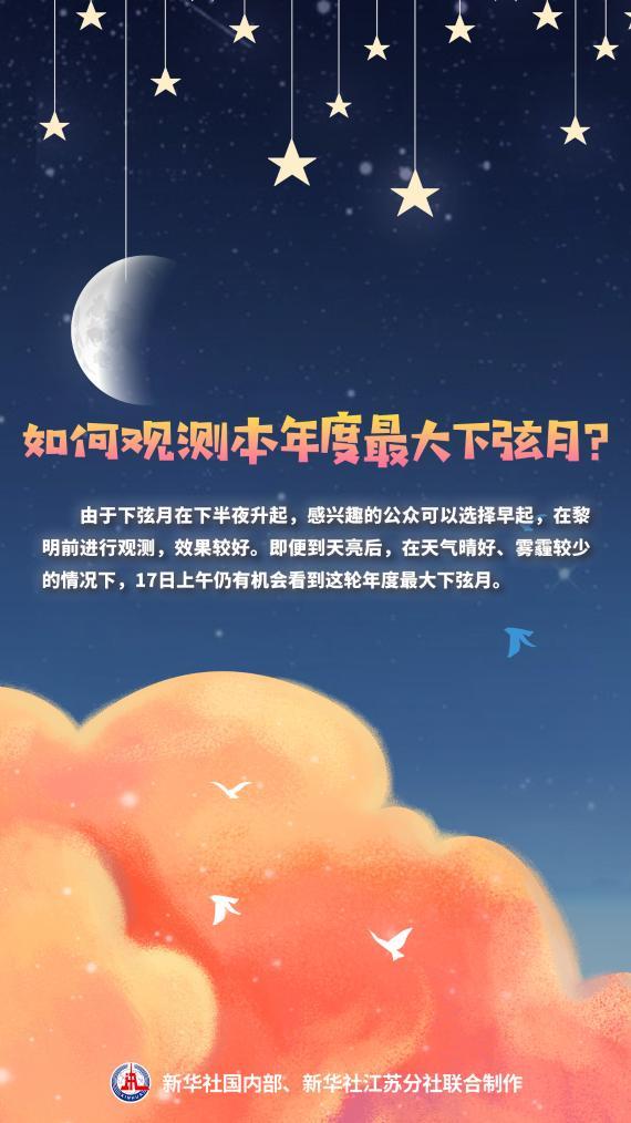 如何观测本年度最大下弦月?王科超建议,由于下弦月在下半夜升起,感兴趣的公众可以选择早起,在黎明前进行观测,效果较好。即便到天亮后,在天气晴好、雾霾较少的情况下,17日上午仍有机会看到这轮年度最大下弦月。