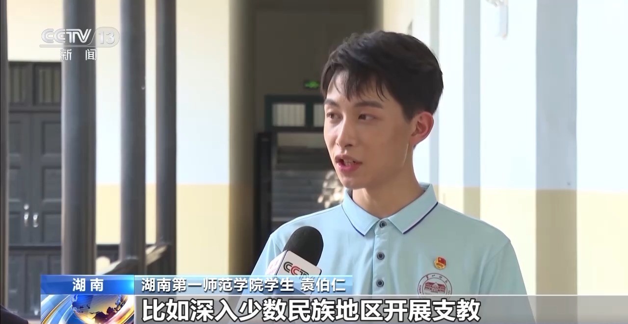 湖南第一师范学院学生袁伯仁:作为一师的学子,我曾积极参加学校组织的各类活动,比如深入少数民族地区开展支教。在今后的学习和工作中,我将继续牢记一师的校训校风,传承红色基因,为中华民族伟大复兴贡献自己的青春力量。