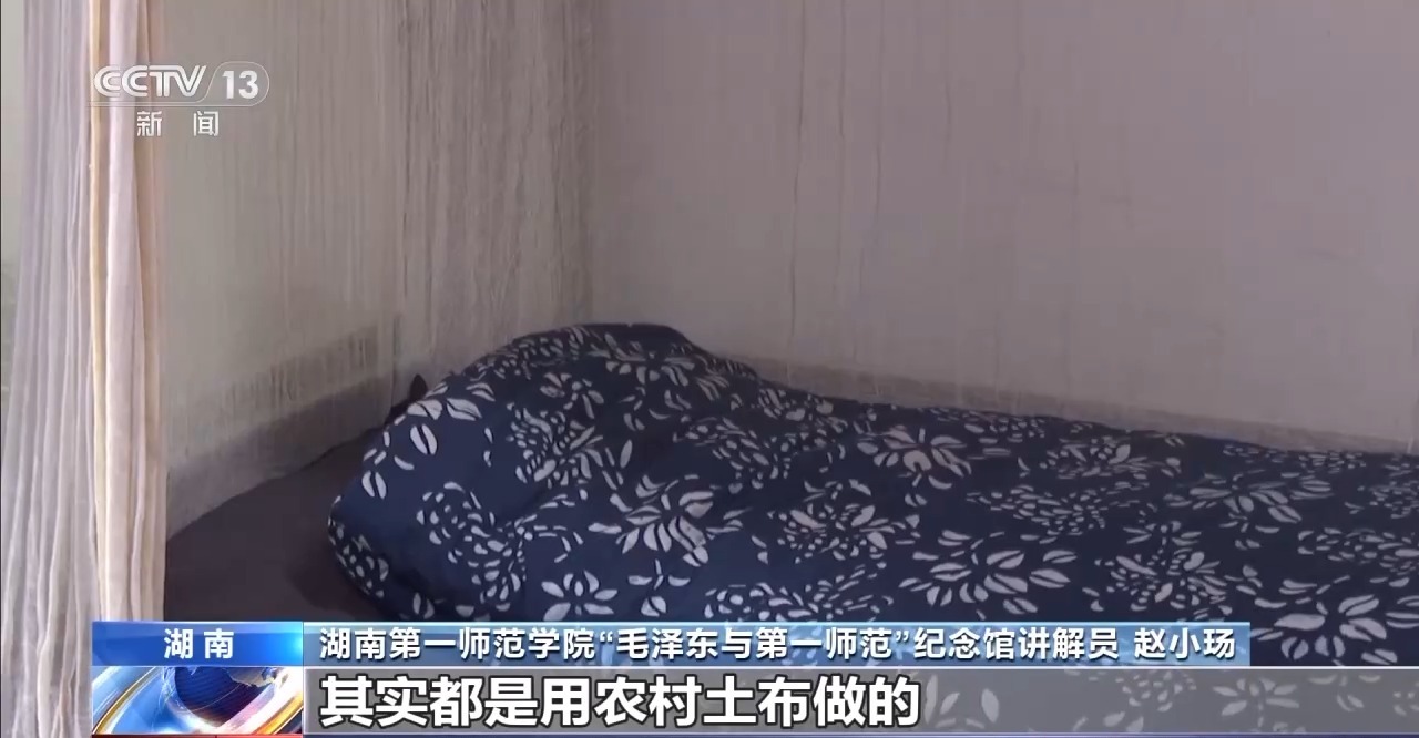 湖南第一师范学院“毛泽东与第一师范”纪念馆讲解员赵小玚:这张床位就是他当年的床位,床上盖的、垫的、用的其实都是用农村土布做的,毛主席在个人生活上非常节俭,在第一师范求学5年半,总共花去家里160多块钱,其中绝大部分都是用来买书和订报。当年在这个寝室里他还提倡“三不谈”,不谈金钱、不谈家庭琐事、不谈男女问题。严于律己,同时也影响了身边一大批志同道合的朋友们,很多都走上了革命的道路。