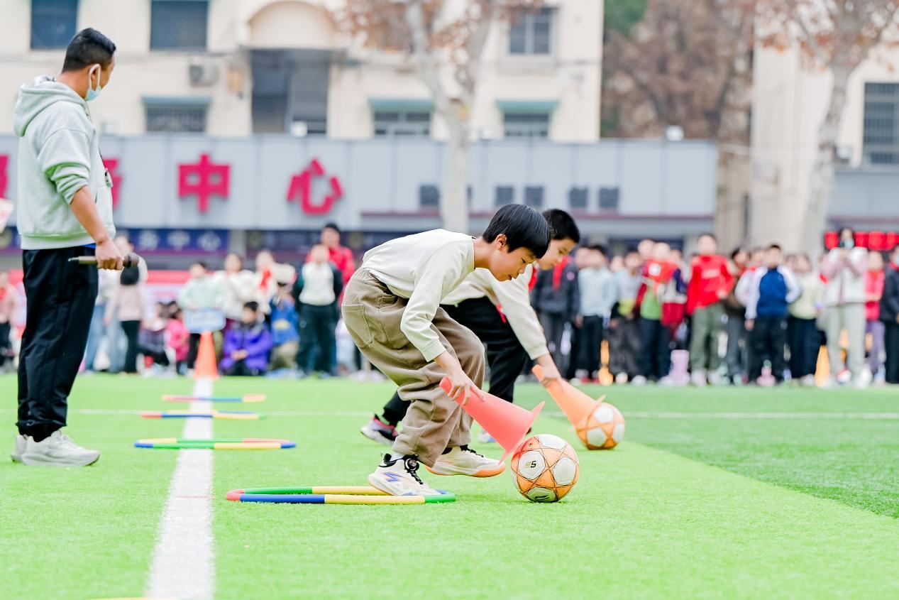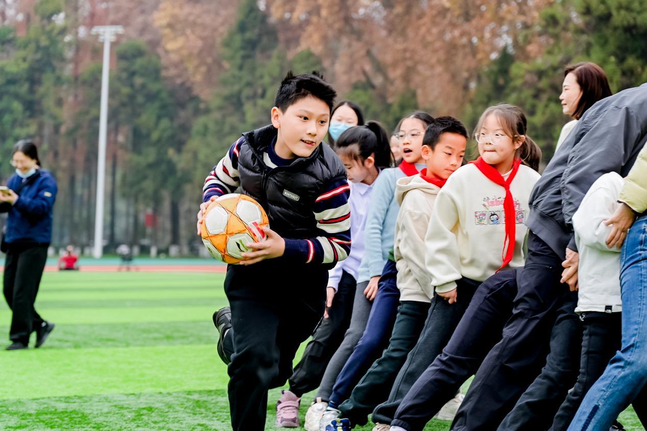 “大带小”组队的创新模式让赛场更添温情。低年级小同学和高年级学长学姐同组参赛,在“火车过山洞”项目中,家长与孩子手搭手组成“隧道”,足球在腿间传递,六年级男生小李特意放慢速度,提醒身后的一年级学妹“别着急”。
