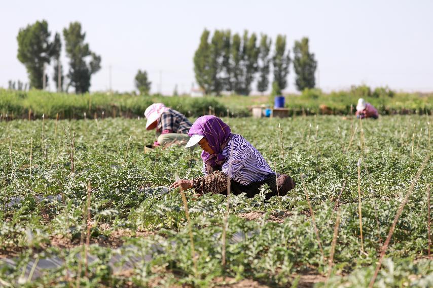在甘肃省酒泉市金塔县中东镇上四分村西瓜制种地里,工人对西瓜进行人工授粉(6月11日 摄)。新华社发(曹红祖 摄)