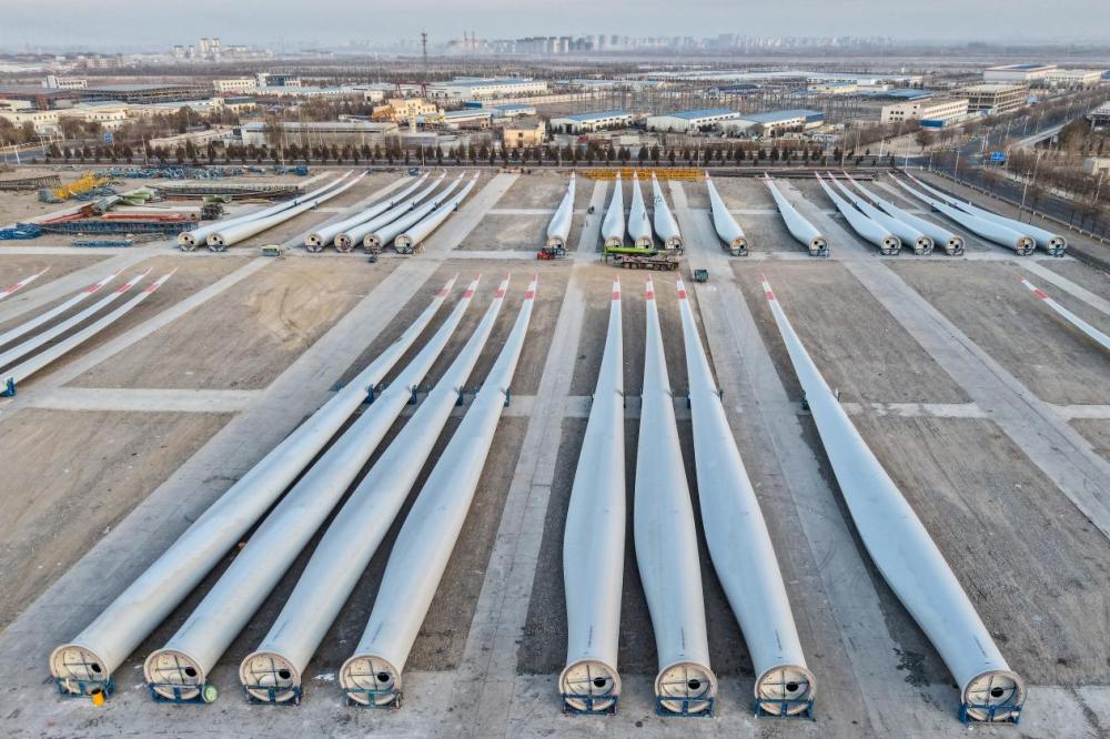 11月20日,在甘肃省酒泉经济技术开发区一家风电装备生产企业拍摄的风机叶片成品(无人机照片)。新华社记者 郎兵兵 摄
